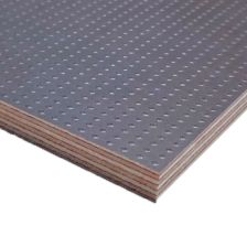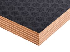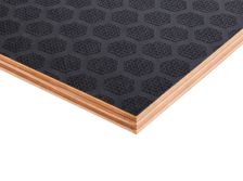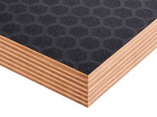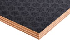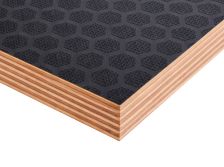 Листы изготавливают из березового шпона, склеенного фенолформальдегидным клеем, с нанесением ламинирующей пленки и сетчатого покрытия на одну или обе стороны. Сетчатая поверхность обеспечивает противоскользящий эффект, что делает материал идеальным для полов и платформ. Фанера устойчива к влаге, перепадам температур, механическим нагрузкам. Береза придает высокую прочность, а ламинирующая пленка защищает от воды, химикатов, истирания. Толщина листов — от 6 до 40 мм, стандартные размеры — 1220х2440 мм или 1500х3000 мм. Материал легко режется, но сложнее поддается тонкой обработке из-за покрытия. Экологичность ограничена из-за фенольного клея, поэтому фанеру редко используют в жилых помещениях. Высокая износостойкость и противоскользящие свойства делают ее востребованной в транспорте и строительстве.